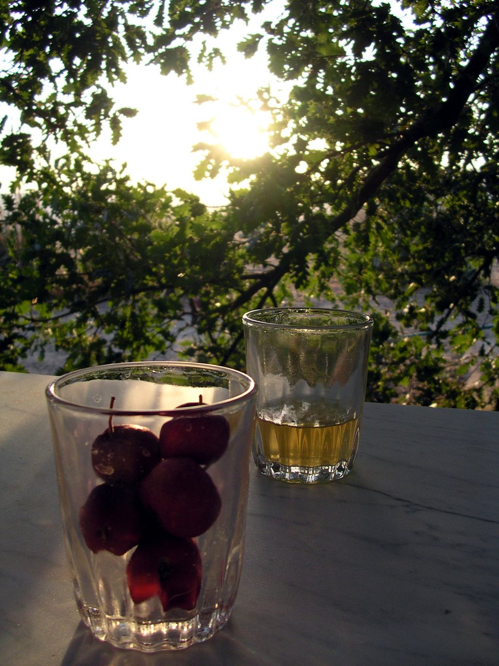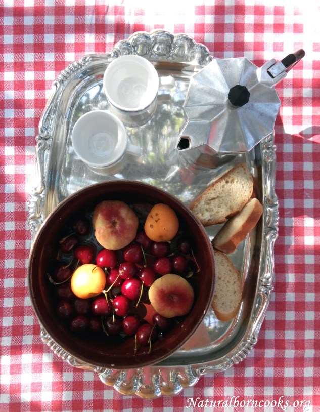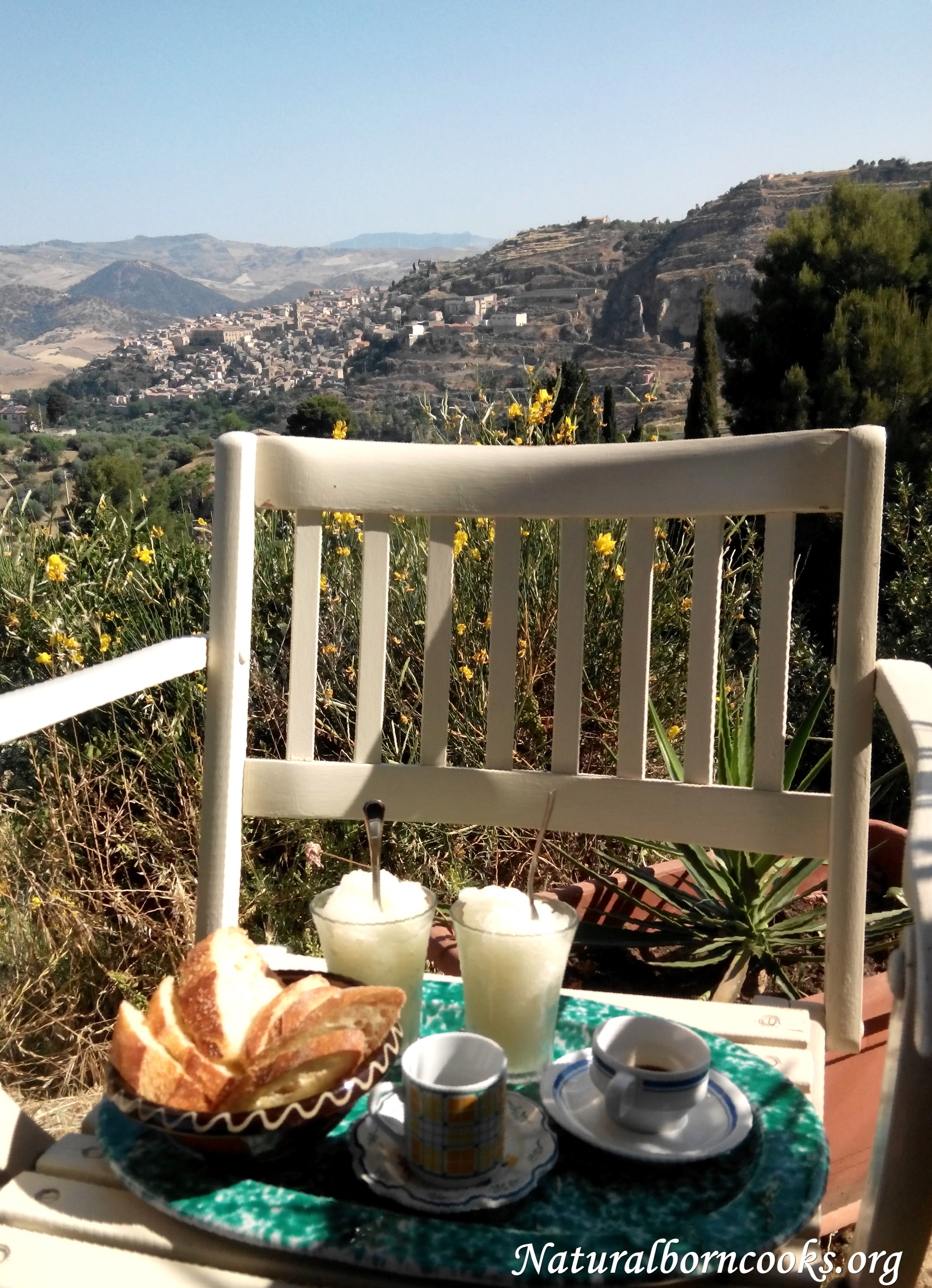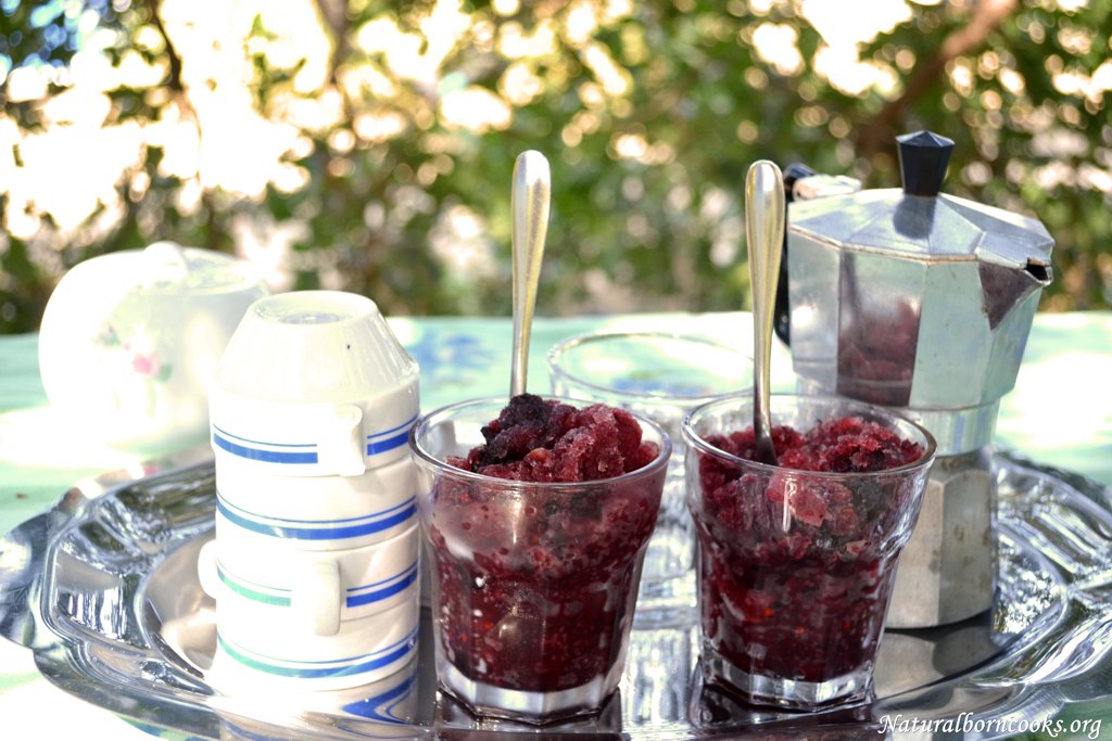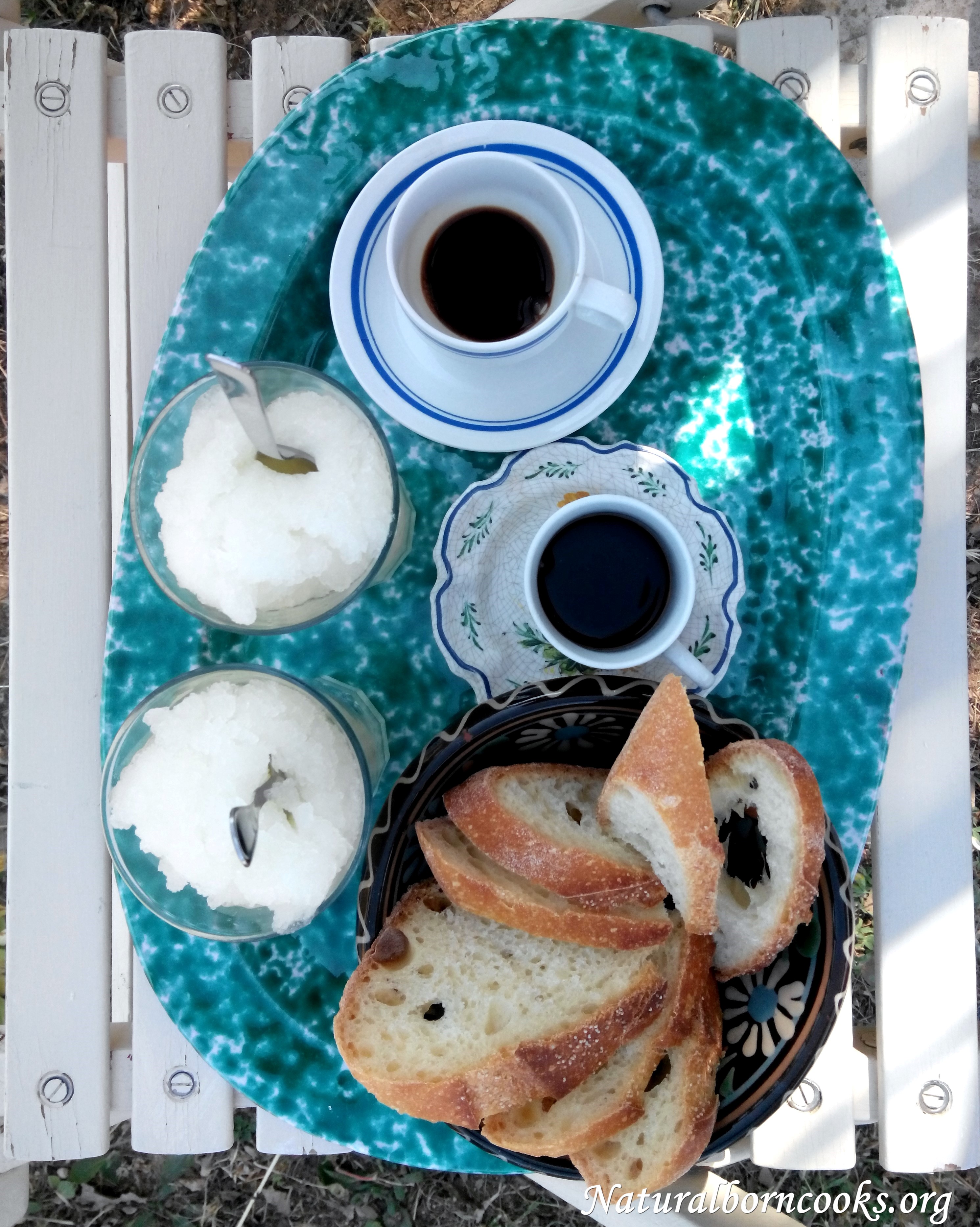 Se riesci a sfruttare la momentanea sensazione di benessere data da questa promessa di gioia per andare in cucina e prendere la granita dal freezer e dalla dispensa le brioches o il pane, la giornata ha una speranza di essere portata a termine e soprattutto, di avere un senso. Non farti rovinare il morale dai bollettini di guerra della tua testa che dicono che la sua è solo una finta tregua e che in realtà lo stronzo sta solo affilando il piccone, spegni la radio nel cervello. Dirigi tutte le tue energie su ciò che è veramente importante: limone o gelsi. Ieri gelsi. Oggi limone. Se hai scelto la brioscia il tuppo è la prima cosa a saltare. Un morso ed è tutta spettinata. Una voragine bianca al suo posto. Quel dolce boccone soffice come una nuvola ti da la forza di apparecchiare la tavola sotto la cupola di rami e di metter sul fuoco (brrr….) il caffè. Proprio per stemperare il trauma dell’aver acceso un fuoco, corri a prendere un po’ di frutta e la tuffi nell’acqua ghiacciata. La tavola si trasforma in una promessa di paradiso…