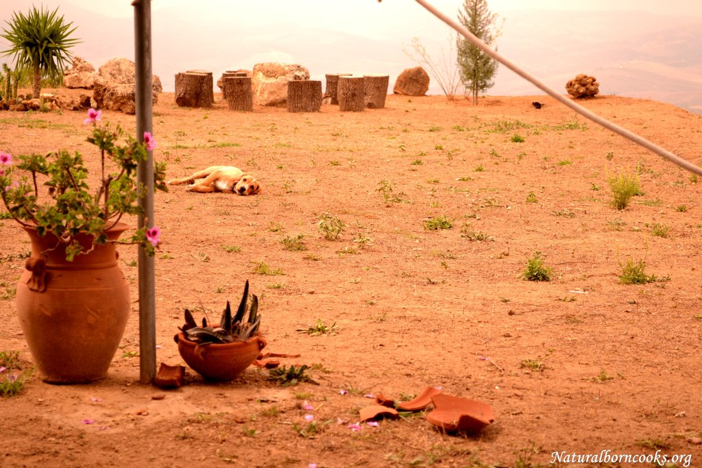 Lui ci prende a colpi di piccone e noi ci ripariamo con teli di cotone, bagnati. E funziona. Un esempio di pacifismo efficace. Anche perché è inutile mettersi a combattere con lui, è una battaglia persa. Meglio giocare d’astuzia. Con lui (col sole dell’entroterra siculo) ci si appizza sempre. (Taduzione: ci si perde.)