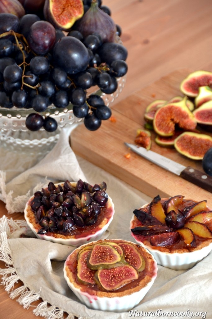 Oggi propongo un ulteriore cambio di forma, stavolta dimensionale. La crostata diventa ‘ina anzi, ‘ine, perchè sono tre. E si riempie di frutta di Settembre, uva, prugne e fichi. E di confettura di mele cotogne cotta al microonde. (Io sono microwaves oven addicted, sono sempre stupefatta dalla sua versatilità e comodità, ho una bella lista di roba microondabile, ve ne parlerò prossimamente su questi schermi.)