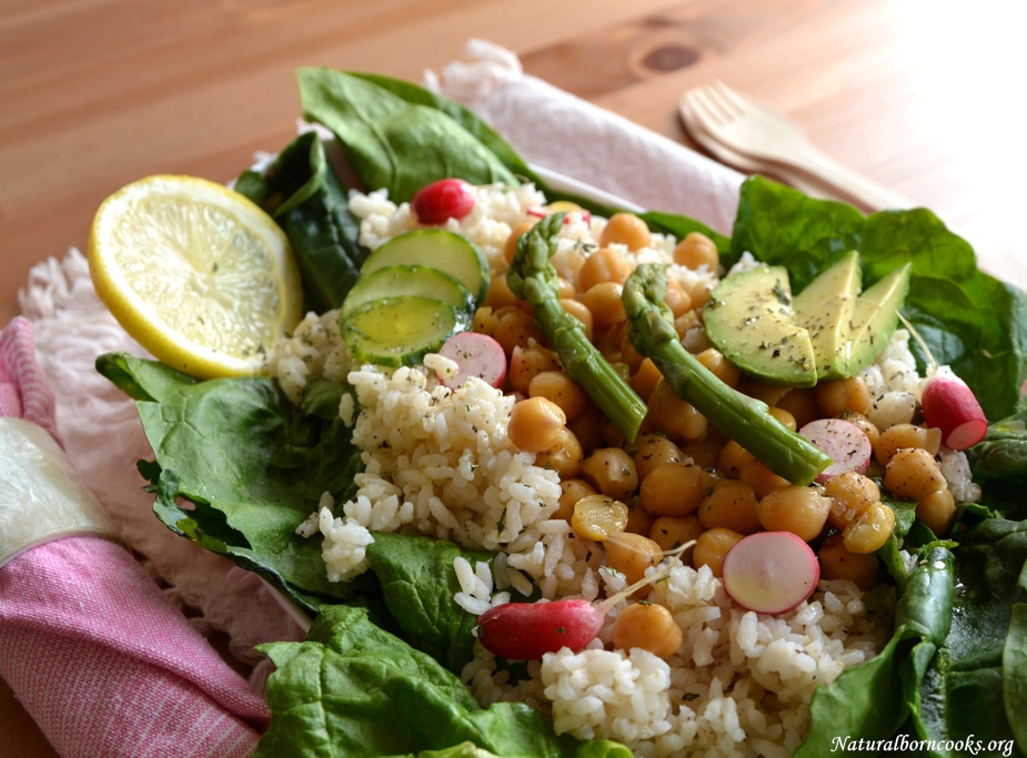 SPRING SALAD WITH CHICKPEAS, WHOLE RICE AND STEAMED ASPARAGUS