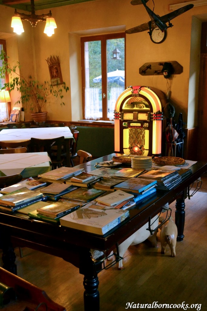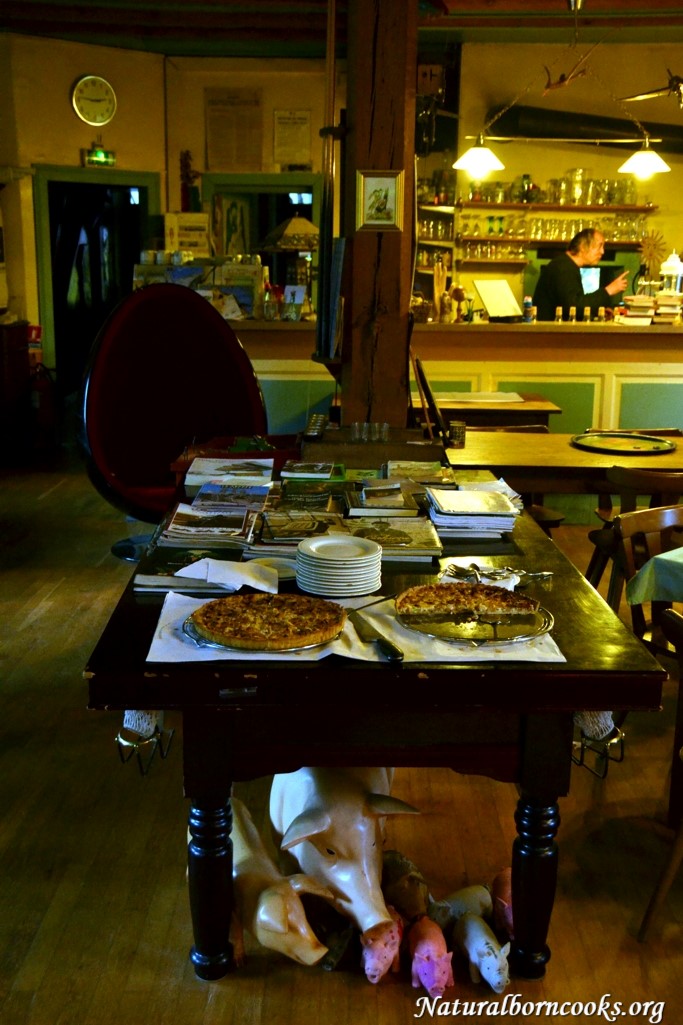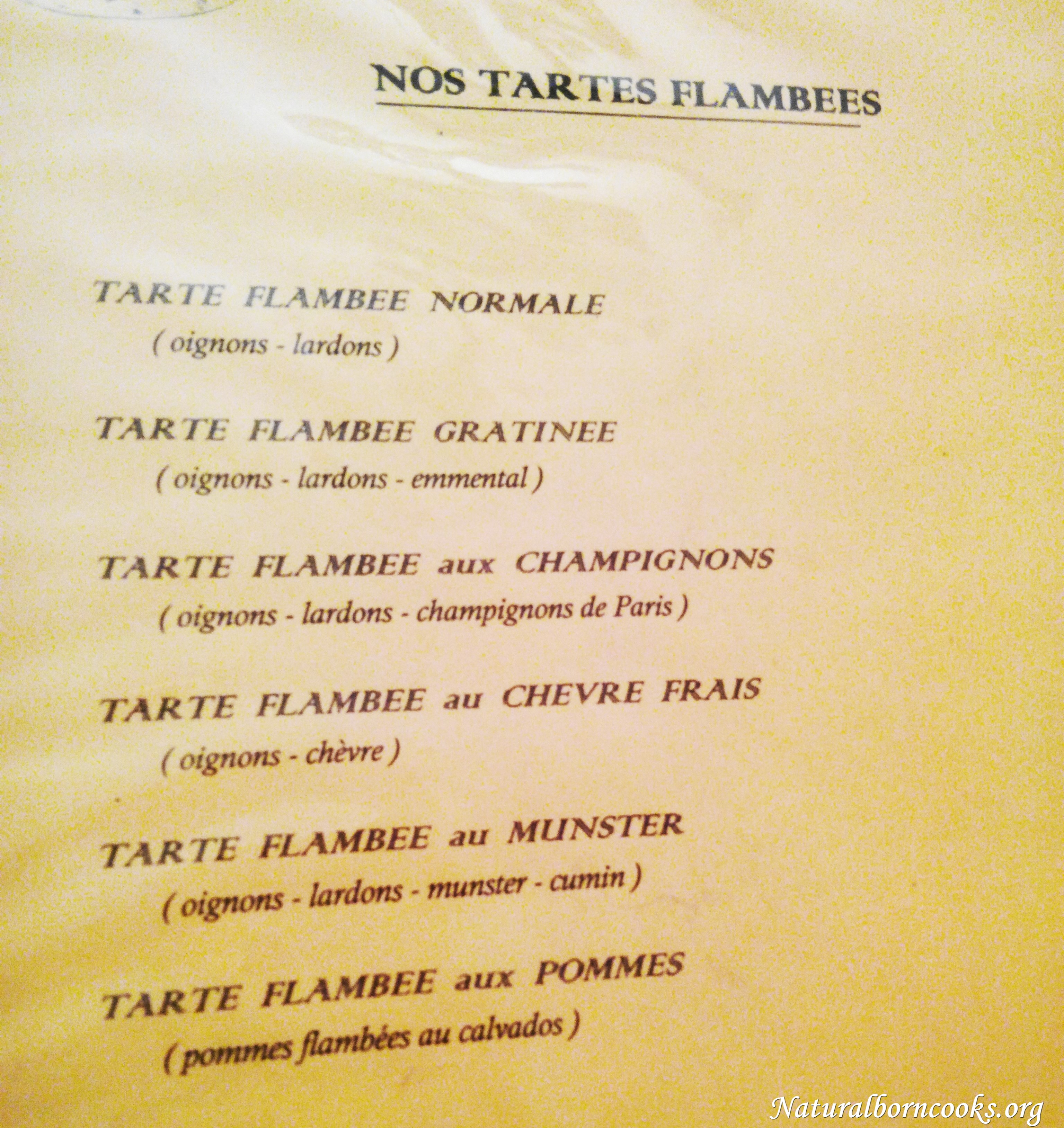 Questo ristorante ci piace, Philippe ha capito cosa cercavamo: non c’è l’ombra di un turista oltre a noi, ai tavoli ci sono famiglie e amici che parlano un dialetto incomprensibile a metà fra francese e tedesco con al centro della tavola taglieri di tarte flambée di tutti i gusti, è domenica sera e l’atmosfera è quella di una autentica, tipica pizzeria. Alsaziana. Perchè la tarte flambée è chiamata anche pizza alsacienne. 🙂