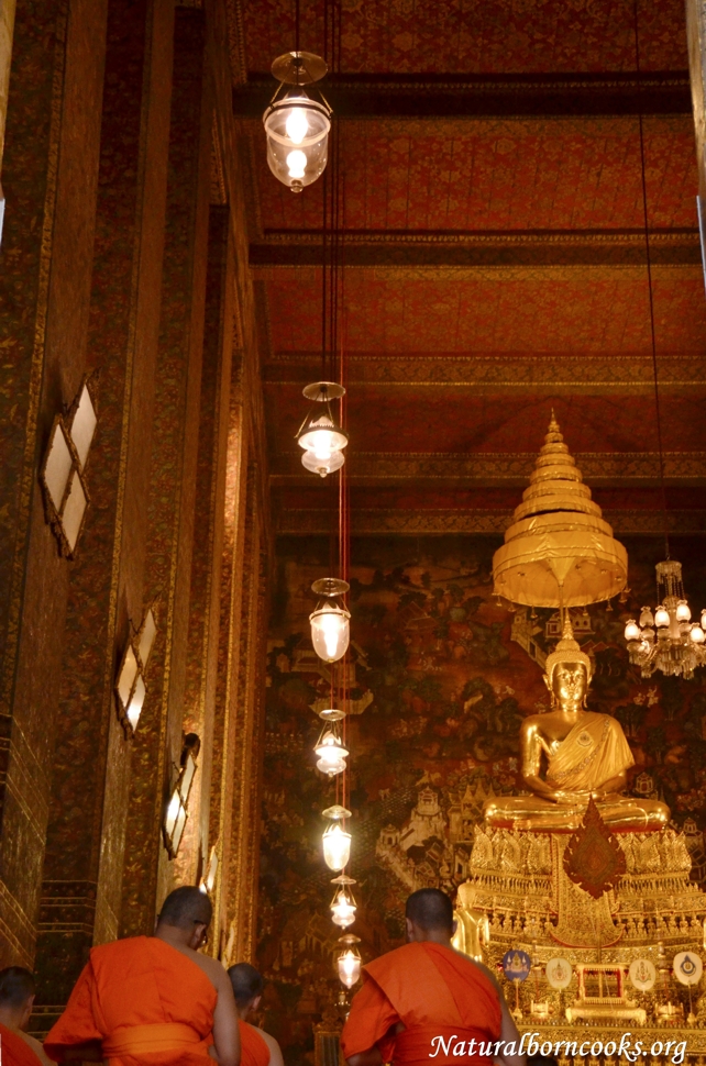 Wat pho temple, Phra Ubosot, Buddha in meditating posture, monks praying